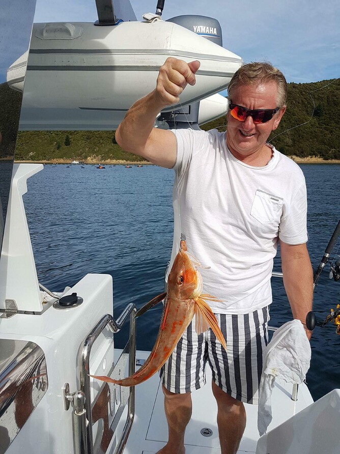 Despite waking tired, Jo and I decided to take a 13km hike from Tennyson Inlet, Duncan Bay to Nydia Saddle and return. The hike was fabulous through natural forest with glimpses of inlets below. We climbed to an altitude of some 430 metres above sea level (photos attached will give you some appreciation of that). We past a group of 8 trampers coming from a lodge in Nydia Bay and on our return trip a couple riding mountain bikes who were in very low gear making hard work of the steep climb over exposed tree roots and little swampy streams flowing across the track. On our return to Duncan Bay and nearing the jetty, we chatted to a couple of fisherman (farmers) who were heading out, who I was hoping would give some local knowledge but as is so often typical of fishermen, they gave nothing away. Robin picked us up in the tender and told us about the nice size gurnard he caught while waiting for us. We had a yummy late lunch (needed for me to recover from the walk) and decided we wanted to head around to Lydia Bay for the night. Even though we were going to try fishing Horseshoe Bay (Gurnard Bay to us) we took some chicken out of the freezer as an insurance policy. We fished the old successful spot and Robin hooked up a beauty (see photo). After a beer I was ready for a change of luck and after what seemed a lifetime, I finally hooked up a gurnard that had been playing me for a good 10-15 minutes. At last a fish I could proudly bring on board. By now we had dinner sorted so the chicken went back into the fridge. That will be dinner tomorrow night.