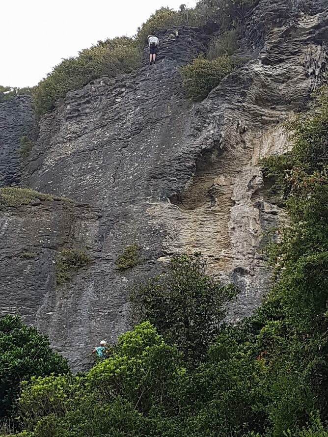 I had to post some documents today so we walked the 1.6k to the general store where the mailbox was. They were very helpful giving me an envelope and selling me the stamp and a couple of items we needed. We walked back down the road to the local cafe and enjoyed an awesome coffee or two. On the way back we took some photos of the roadside features, predominantly rock formations. As you can see in one photo these were being exploited by participants in an Outward Bound activity. This was a seriously high vertical structure. The other photo shows a huge rock structure that rests on another. The one on the right was pushed over to meet the left hand side rock during an 8.2 magnitude earthquake around 1930. The rock was chiseled away from below to allow the road to pass through again. Some of these overhangs looked really precarious and I felt like running under them rather than walking!