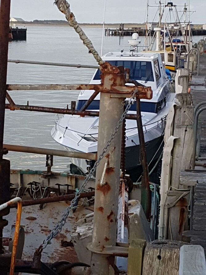 We were now about an hour out so I got on the radio to Bluff Harbour but after multiple attempts I received no reply. Thankfully Maritime radio heard me calling up and responded asking me to try one more time and if they heard no response they would phone them on my behalf and radio back. That was exactly what happened, Maritime radio confirmed we had permission to roll on in to port. The entrance to Bluff was sheltered from the winds that particular day or I was going to travel further east and enter from the eastern channel to avoid turning beam on to the sea. We rolled in without incident and were met by Meri who drove down to direct us to the jetty location. She asked for our ropes and assisted in tying the boat off. We could see that she was an experienced deck hand|skipper. Apparently her and her first husband were fishing these parts for many years which is where Meri first developed an interest in providing this radio service to the Fishermen of the Southern region.
