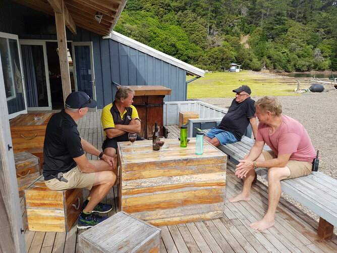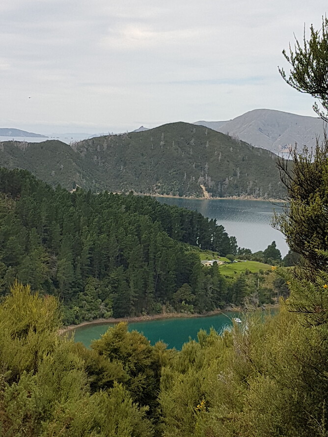 Started our day with a swim around the buoy in the bay - Joanne left me in her wake but we are making it a daily routine for the next fortnight where I am sure I will get better! After breakfast we went exploring ashore and met the proprietor of the resort and his Skipper. He shared local knowledge of the walks we could take so we naturally chose to do them all. The views were rewarding to say the very least and we found ourselves creating our own way back via a steep embankment until we decided it might be too ambitious for our preparedness for steep descents. The photo shows the view from the half way point. We had a fantail follow us all the way up and down and we saw recent deer signs everywhere. Once we came out in the valley below we came across the resorts’ hen house with their hens and a couple of healthy looking Weka wandering around the area. Jo checked the nesting boxes and yes there were fresh eggs waiting for collection. On returning to the resort we decided to reward ourselves with a lovely Marlborough Pinot Noir and chatted with a group of visitors and a large group of women kayakers who just cruised in unannounced to stay in the camping site.