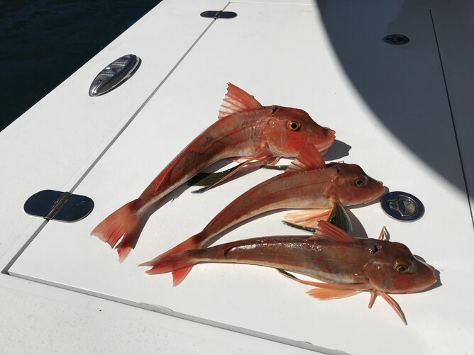 After breakfasts we set off for some fishing to see if we could catch some Gurnard for tea. We pulled into a bay called Horseshoe Bay and dropped anchor. Robin went for plastic baits and after only 15 minutes had caught a 500mm Gurnard. We decided to join him and after trying bait on hooks for what seemed like an eternity, I gave in to Gulp Plastic baits too. Robin had by now pulled in another nice gurnard, so we almost had tea on board! We started pulling up barracuda, and I thought our fishing was done for the day. We set a limit of 12:30pm to stop and with 2minutes to spare Robin pulled in another Gurnard, we were all set for a big feed of Gurnard for dinner tonight!