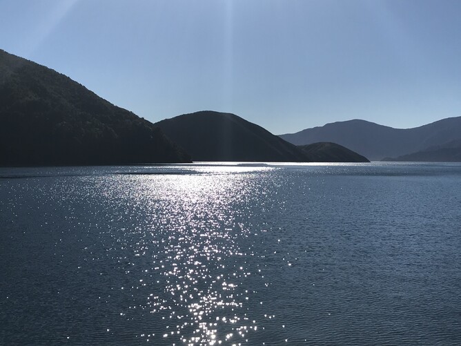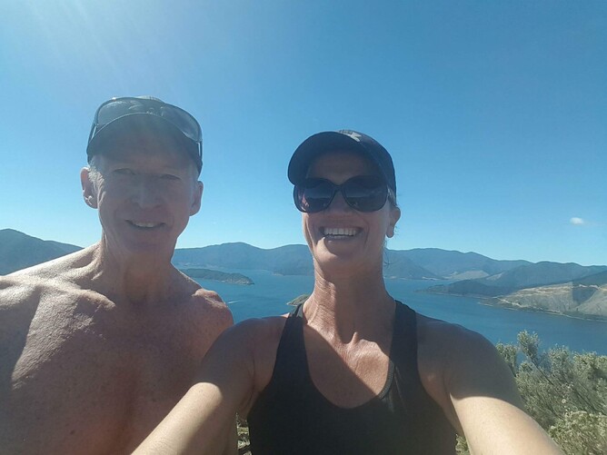 We were shown how to access a scenic walk so Robin dropped Jo and I back to the cafe to commence a coastal walk. We took about 45 minutes to reach amazing views back up the Pelorous Sounds and being always up for a challenge, we looked at the hill top towering above us and wondered how much better the view would be up there. The eyes are very poor at judging distance, much like when you try to swim somewhere, so very soon we were breathing hard and I was running at 129 BPM (according to the Fitbit), felt much harder! We scaled the top after climbing on all fours for part of the 30 - 40 metres but when we reached the top and looked at the panorama around us, it was all worthwhile. We took the photo attached from the summit.
