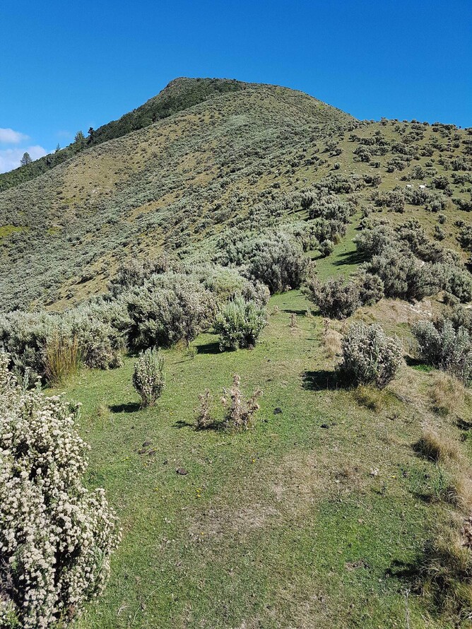 On beginning the descent we had an even better appreciation of the steepness and the metre high bushes that gave us security as we came back down. We were looking down on a small group of Woolley sheep who were staring at us as if to say ‘what the hell are you doing up there and don’t eat any of our bloody grass’.