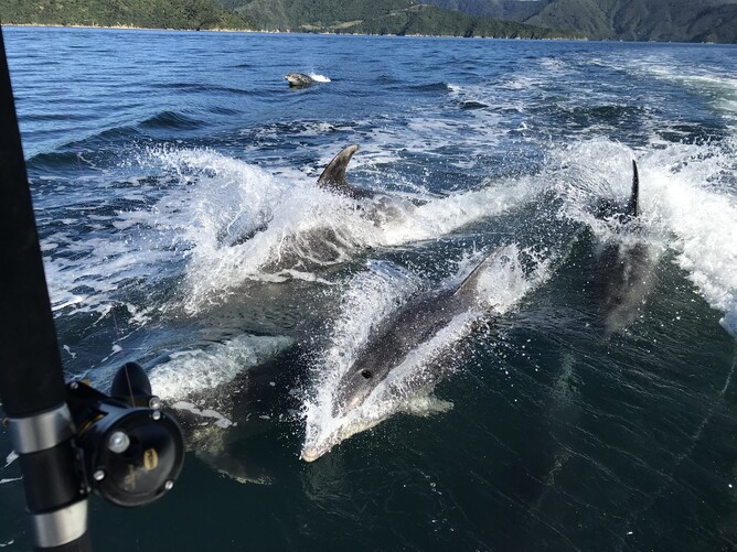 When the ferry skipper arrived, he told us about his encounter with Killer whales about 2nm from the cafe. When we told him that we picked up a pod of Dolphin (about 20 or so) heading deep into Pelorous Sound, he was very surprised as seldom will Dolphin hang about when these Whales are about. We suspect they were already escaping from them which is why they igmnored us as we passed them. We decided to turn and run with them and see what they would do. Sure enough, in they came and we gave them a ride in our wake at 12 knots for a couple of nautical miles before we decided we needed to turn and head for our destination. They loved riding our wake and swam within touching distance of our Boarding platform. These were big Dolphin as you will see from our photo so it was a beautiful encounter in a quiet place.