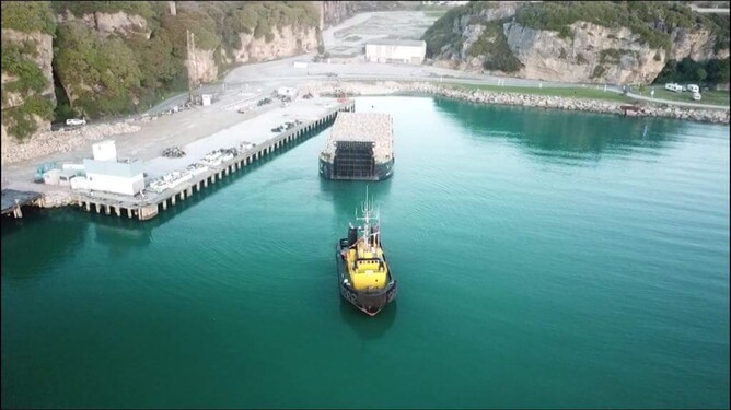 Auckland Tug Kurutai leaving Port with huge fully laden barge in tow - destination Wellington.