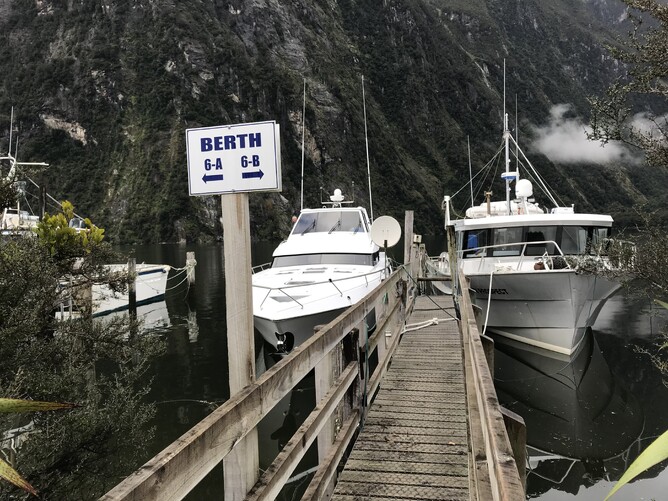 Entering Milford we discovered that it was blanketed in low cloud giving the whole Sound an eerie atmosphere. At first I said to Robin, what a shame the weather is crap for our run in but very quickly changed my mind as we entered a ‘Lord of the Rings’ scene. The vertical rock faces were disappearing into the clouds and mist, with water cascading down these massive rock structures towering thousands of feet above us. It was an unimaginable scene, something I had never seen anything like in my life, I was spell-bound. We were crawling along about 5-7 knots following the multitude of tourist boats loaded with people, cameras in hand, creeping along the shoreline only a few metres from the cliff. We stopped occasionally to take our photos and to listen to the sounds of the waterfalls. Mitre Peak was on our right and was lost in clouds, we didn’t see that until the following morning. My depth sounder failed immediately we entered the sound as the waters were simply too deep for the transponder mounted under the hull to cope with. The photos will hopefully give some sense of the wonder of this untouched natural landscape. It was almost like rock cathedrals reaching high into the sky. I tried to set up the satellite phone to let people know we had arrived safely but even that wouldn’t work in the confines of Milford Sound.