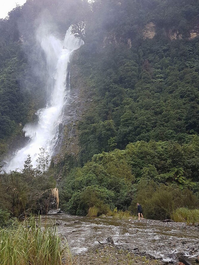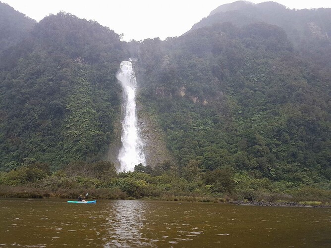 Shortly after midnight we were awaken by the most violent thunderstorm with huge bolts of lightning. Then Horizon III was thoroughly doused in hundreds of millimetres of rain, which we were pleased about, as it washed all the salt from Horizon III following our trip the previous day. The following morning we got the kayaks organised to get a better look at the waterfall that we had listened to during the night and also to investigate the tail race from the Manapouri Dam. It was still raining but not so heavy now. We first paddled up the tail race but after about 100Metres or so we realised we were not going anywhere at all, as the current was just so strong, water was screaming out of there! We turned and run with the flow and were out it a matter of 30 seconds or so. No wonder there is a layer of fresh water 3 or more metres deep in here; made up of heaps of water falls and the hydro discharge.