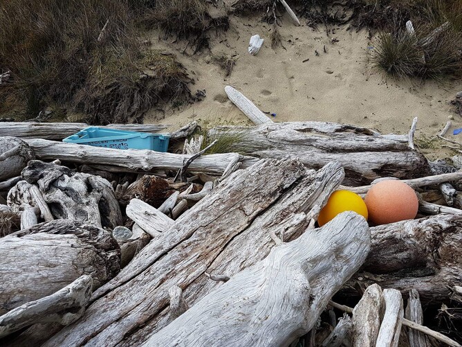 Rope and craypot bait plastic containers and odd bits of plastic with more of the same in the photo below. Floats were scattered all along the beach, broken and complete. The fishing industry clearly is contributing more than their share to the plastic waste in our oceans. I imagine a lot of it it lost overboard in the execution of their job and in bad weather. We just need to accept that we should clean it up and take more care wherever possible. Plastic bags and plastic lined cardboard are a big issue