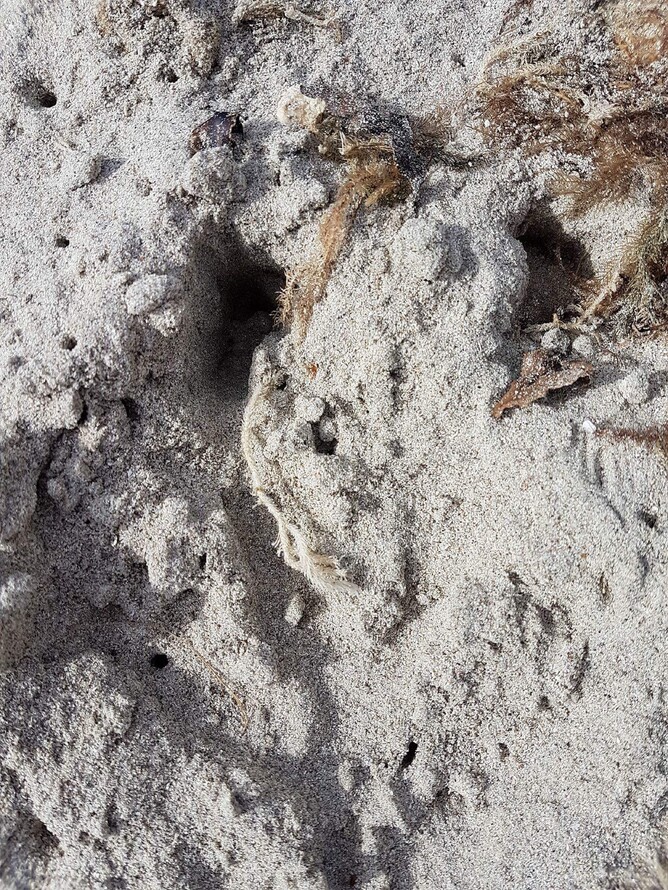Kiwi footprint and the holes he made digging for those clear sand lice?