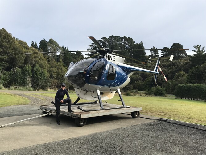 Joanne in front of our short tailed chopper, these are renowned as a sporty and very manoeuvreable machine, perfect in tight landing locations.