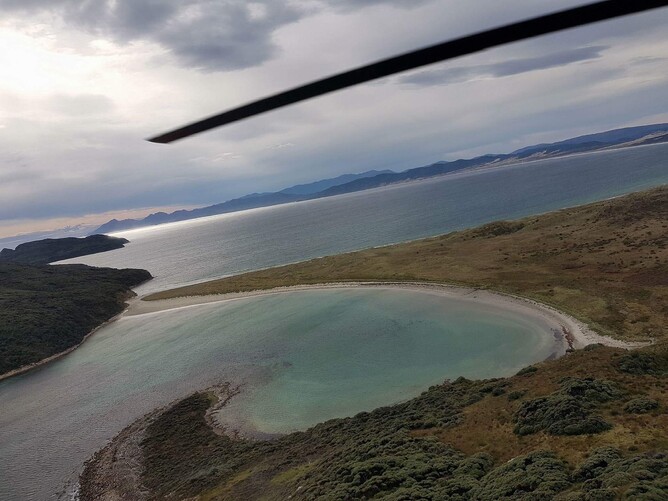 Zane fired up the chopper and we lifted off to vacate over Doughboy Bay which is a huge collector of all sorts of flotsam as well. We headed along the coastline over the Muttonbird Islands which had local harvesters occupying their huts ready for the opening of the season. Muttonbird are rich in Omega 3 and are a very oily meat due in part to their diet of seafood. He says if you want to die you simply stop eating Muttonbird, that is a pretty mean endorsement of the nutritional benefits! I am not ready to try this delicacy yet which apparently tastes very salty more like anchovies. So if you love anchovies you will probably enjoy Muttonbird. The more Jo and I heard about the process of harvesting, the less interested we became; poor we chicks!