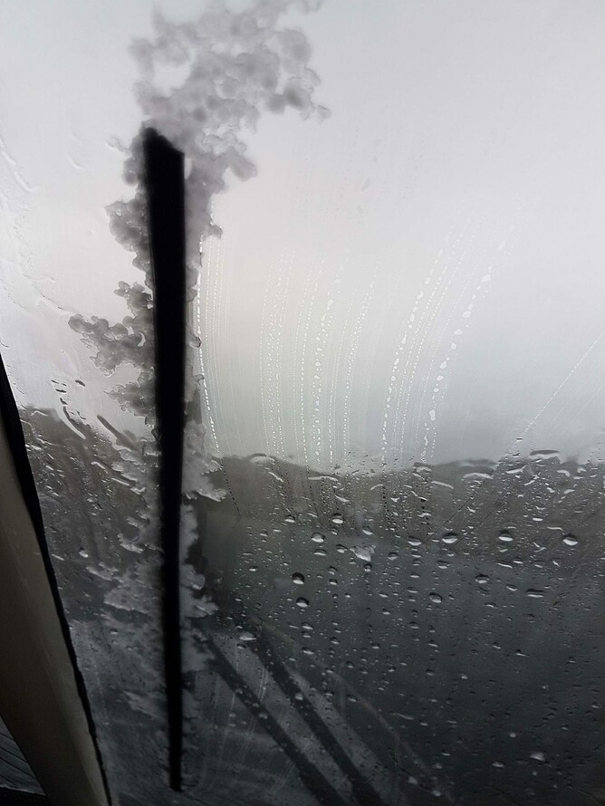 A view of the wind screen wiper covered in Hail stones - the visibility was not great!