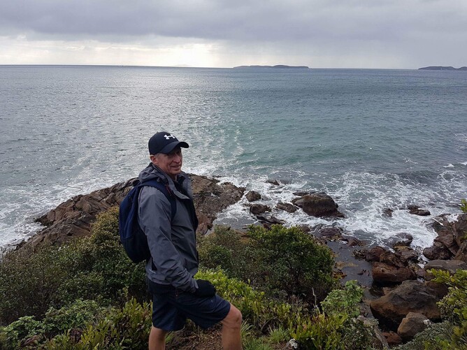 Following the visit to the Stone-house we then left the bikes to scale the steps and track out to the lighthouse around the headland. We were amazed by the bird life through there and surprised to see the level of effort going into pest eradication on the Island. There were tags and signs and traps every 50Metres or so. The coastline below was extremely rugged and with the weather there was a reasonable sea running albeit from the west (our protected quarter). We soon arrived at the end of the track to find the newish lighthouse (solar powered) that replaced the earlier gas powered lighthouse. They used to lug the big gas bottles up the cliff face from the sea below to power the light and the anchor post for this still remains with winch wire in place.
