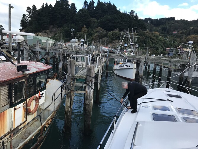 It was a long day at the helm but we were still on schedule as we were running quite fast despite the conditions. Once I was within an hour of Port I made the usual call to the port harbour control on channel 14 to seek permission to enter and to check for any shipping movements during our entry. We were cleared to enter so proceeded to the channel entry point where I contacted Otago Maritime radio on channel 16 to close my trip report. It took us about an hour to reach Careys Bay where we had arranged a berth in the fisherman’s marina. It was great to be tied up and able to walk ashore without getting our feet wet or ourselves. The marina term is used very loosely! How in 2018 it is allowed is beyond my understanding? If I provided employee access of this nature I would expect to be prosecuted. No handrails, rickety structure moving around under foot, planks broken, diesel leaking onto the deck and into the sea from a fuel pump hose; (I phoned the fuel company to advise and turned the main valve off). They said they would send someone out to fix it?? I guess the whole issue is the cost of a replacement Marina and having to tell the fisherman the cost of mooring there would go up 500%.!!