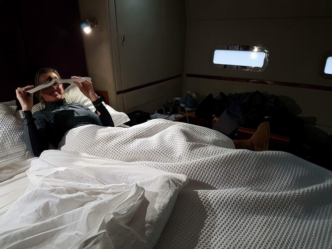 I checked on Jo periodically and she wasn’t feeling great so I got her an earplug, once that was in place inher ear she began to feel better. Not enough to come up top again though! Based on my own experiences it is better to be up top facing forward but I guess if you don’t want to see the size of the ocean - below decks is best.