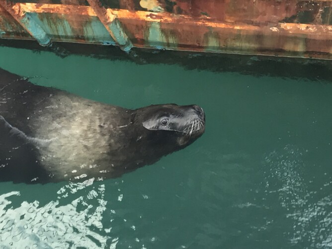 Our curious welcoming by a 120 Kg Sea Lion - he gave us a hell of a fright as we hadn’t seen him swim up. Apparently the berth holder, Peter, said he would have been looking for a fish as he always gives him a feed on arrival! Our fish supplies were depleted so he wasn’t having any of ours!