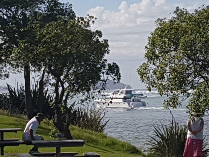 I radioed Whitianga to advise we would be crossing the bar in 15 minutes or so, once we had reached the mark and assessed the situation. I would radio once we were in the Marina, as recommended by Coastguard for Tairua bar users. I rechecked our lead marks and after a large swell rolled under us, we were off. We were running at about 18 knots constantly readjusting our boat speed to stick with the wave. I let a couple roll under us before choosing the one to take us all the way in. Robin watched out behind, calling the following wave position while I focused on the task in front of me. In our final push, the nose of H3 was just touching the back of two waves standing ‘bow high’ in front, they were about to break. They compress up as they hit the shallows, now the stern of the boat was being pursued by another building wave immediately behind. Just then the radio burst into life, it was Whitianga Coastguard following up to see if we had made it through ok. I tried to respond but it became clear he couldn’t hear me, so I dropped the microphone on the seat beside me to focus on the task in hand. Paku obscures the radio signal creating a blind spot - not ideal! I was feeling bad that they were worrying about us and I couldn’t allay their fears. We continued to slow, as the sea compressed, until the waves had collapsed in front enabling me to speed up, staying clear of the following, now breaking wave.